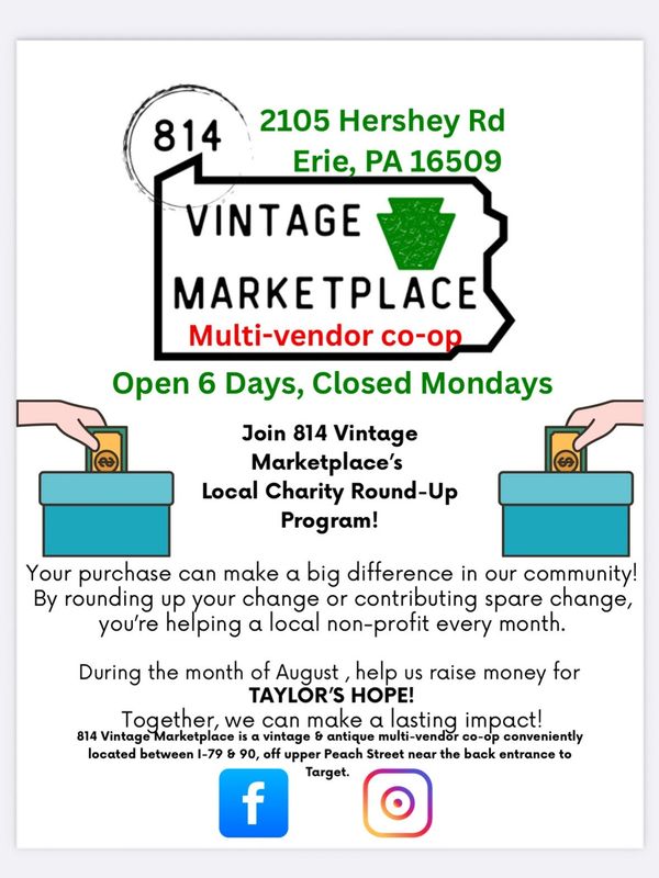 For the entire month of August, 814 Vintage Marketplace is raising donations for Taylor's HOPE. They are rounding up our purchases and asking for any spare change to assist our mission of educating, creating awareness, and eliminating stigmas regarding substance use disorder, mental illness, and the use of illicit drugs. Please stop by, find your vintage treasure, and round up your purchase!