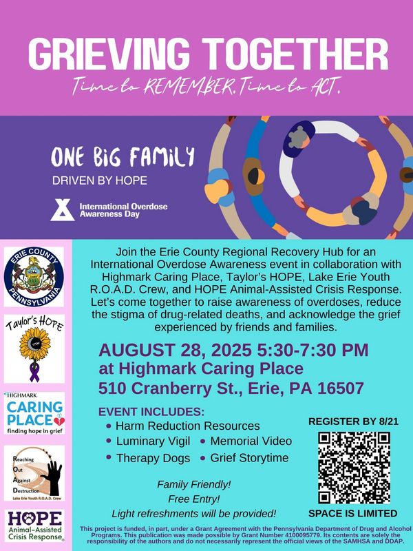 Join the Regional Recovery Hub for an International Overdose Day Awareness event in collaboration with Highmark Caring Place, Taylor's HOPE, Lake Erie Youth R.O.A.D. Crew, and HOPE Animal Assisted Crisis Response. Let's come together to raise awareness of overdoses, reduce the stigmas of drug related deaths, and acknowledge the grief experienced by friends and family.